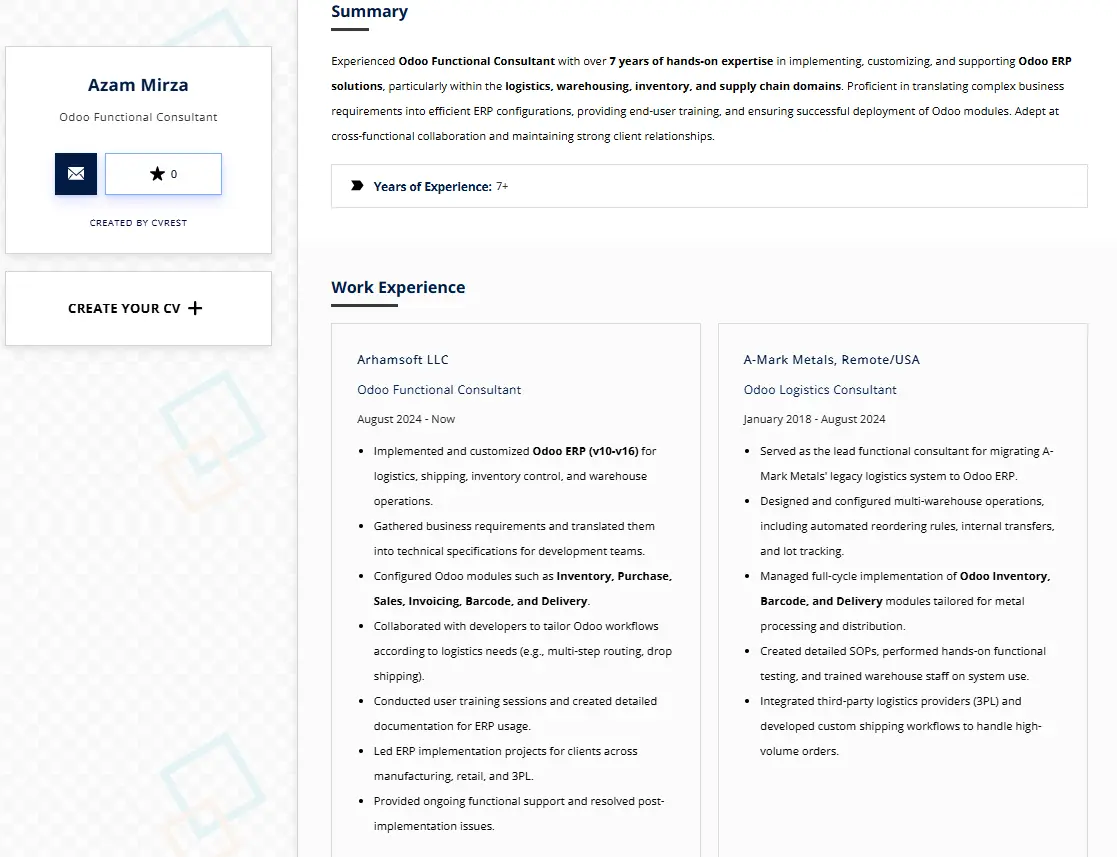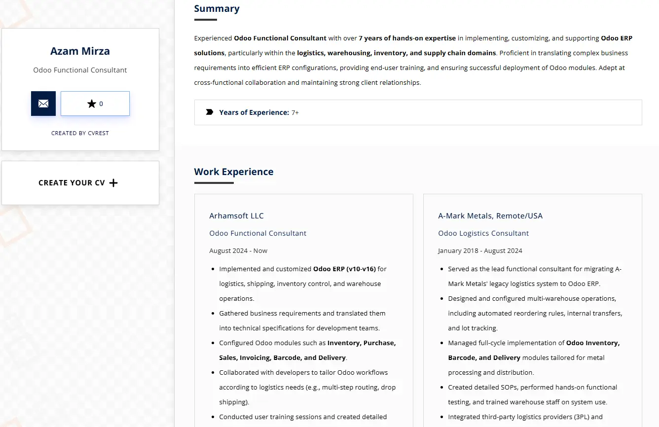 Having a strong resume is important when you’re trying to get a consulting role. As an Odoo consultant, your CV should clearly show how you worked with business processes, set up Odoo modules, and delivered real results. A clear and well-organised CV helps you stand out. It’s also useful to know how your experience compares to typical Odoo consultant salary levels and to look at real consultant profiles on the best Odoo websites to see what companies highlight.