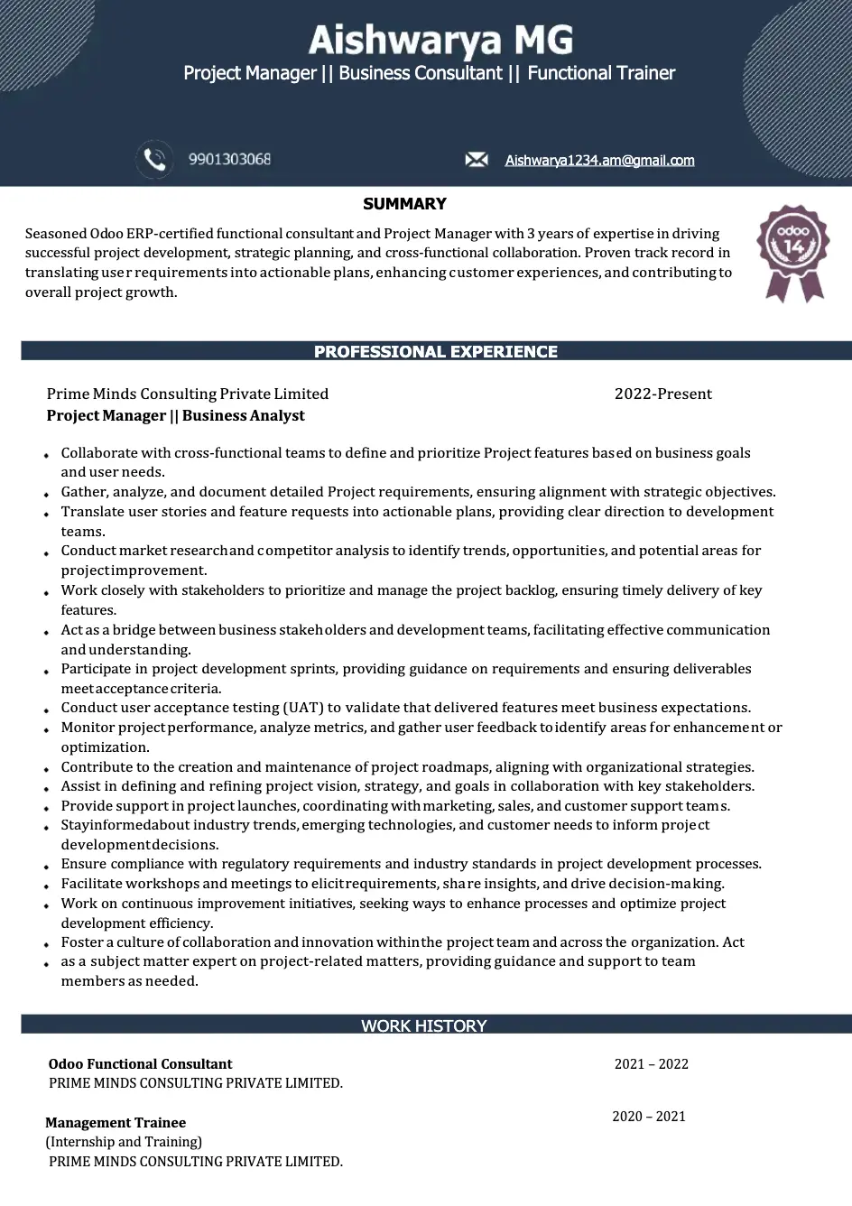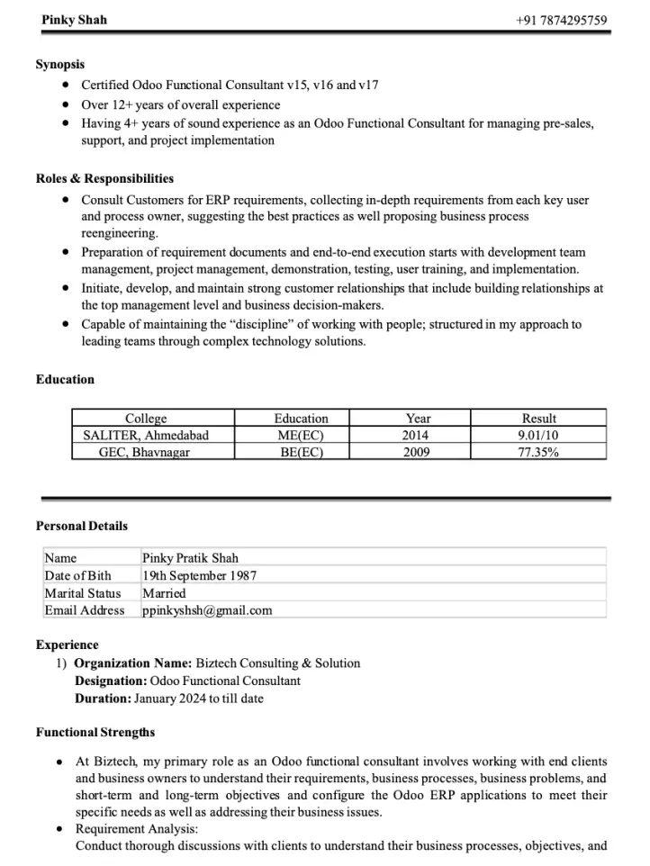 This sample of CV for Odoo consultant mixes strong business analysis experience with hands-on Odoo techno-functional work, making it ideal for roles that require both process understanding and technical configuration. It highlights requirement gathering, documentation, data migration, training, and cross-team communication – all key strengths for consultants who support end-to-end ERP implementations.