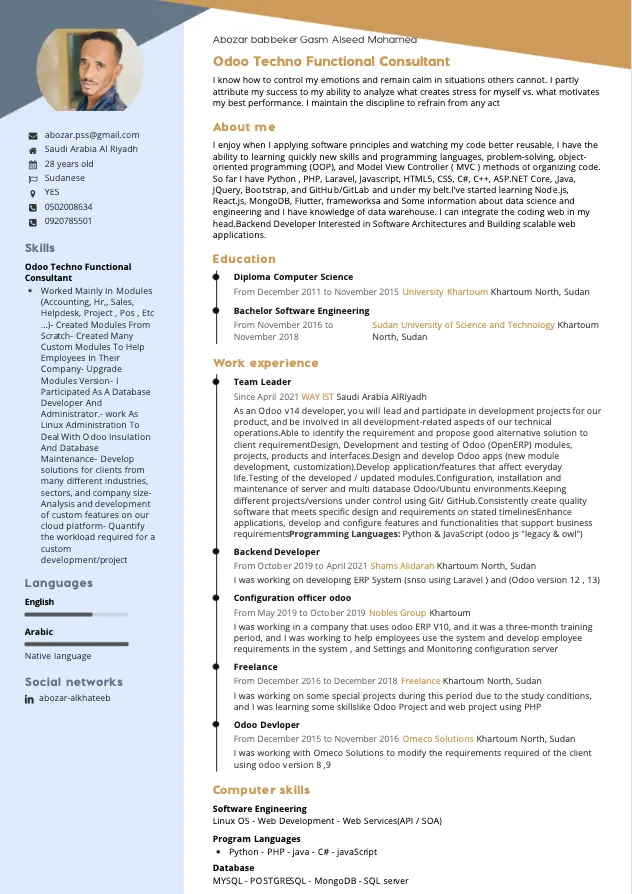 This Odoo technical consultant resume sample stands out because it shows deep experience across both development and functional work, including custom module creation, backend programming, database administration, and multi-version Odoo setup. It’s a strong example of a consultant who can handle full-stack coding while also supporting requirements analysis, deployments, and client-facing solutions across different industries.
