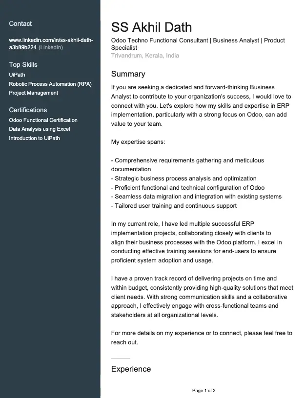 Before you start preparing for interviews, make sure your resume already reflects the key areas covered in most common Odoo consultant interview questions: process mapping, module flows, data handling, UAT steps, and communication with business users.