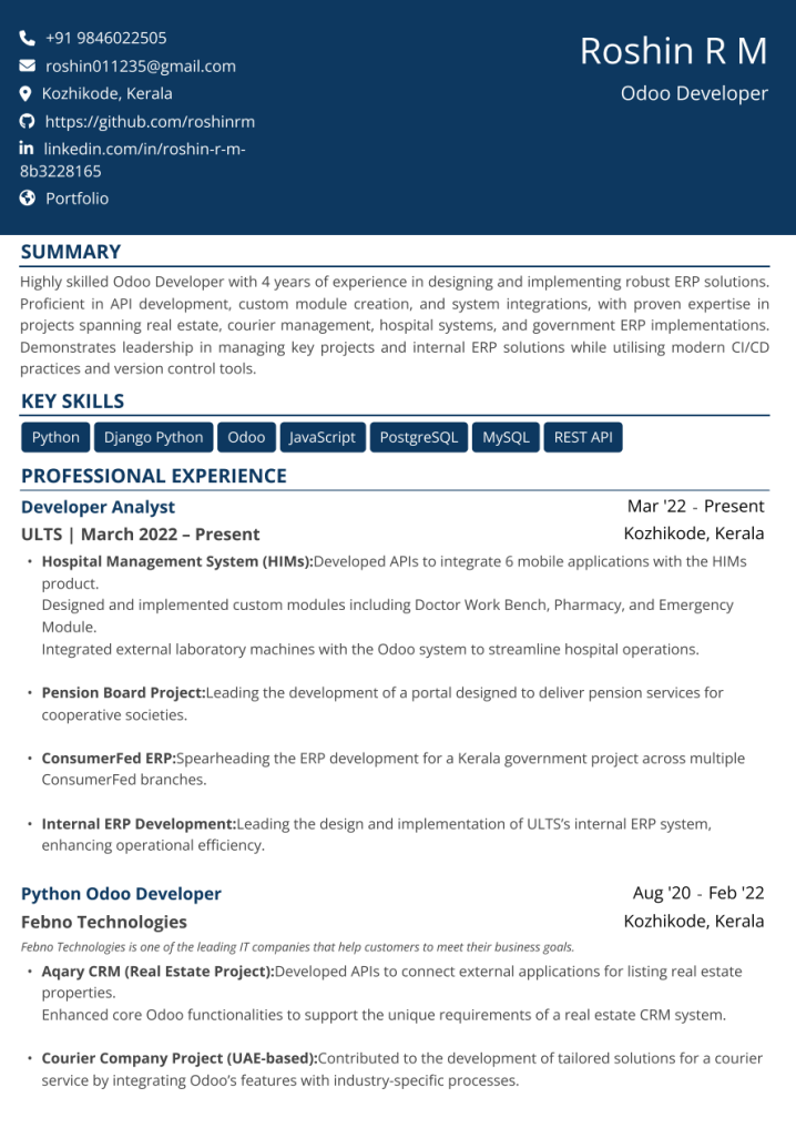 This resume is ideal for a middle-level Odoo developer because it highlights several years of hands-on module development, API integrations, and real-world ERP projects across different industries. It also shows growing leadership and ownership of internal systems, which positions the candidate well for mid-level responsibilities. This level of cross-module and cross-system experience is a common highlight in a well-written sample Odoo developer resume.